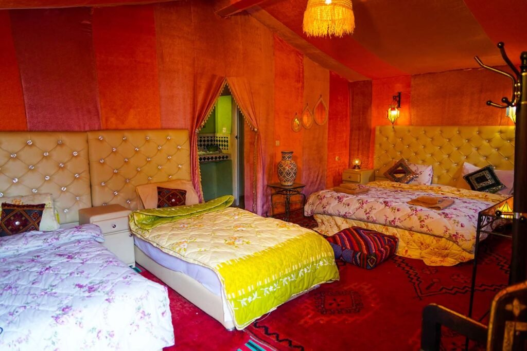 La Chambre familiale de Sahara Garden est conçue pour accueillir les familles et les petits groupes qui souhaitent Spacieuse et décorée avec des matériaux naturels, la Tente Familiale crée une atmosphère apaisante où chacun peut se détendre et profiter du calme du désert.