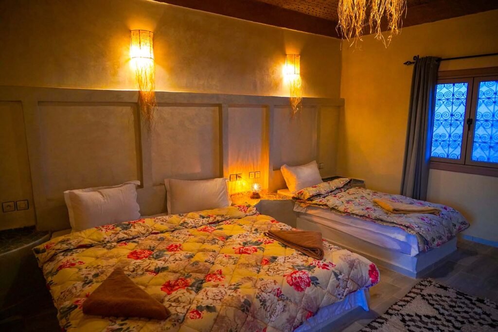 La Chambre Triple de Sahara Garden est idéale pour les amis, petites familles ou voyageurs souhaitant partager un séjour ensemble tout en profitant d’un espace confortable et chaleureux.